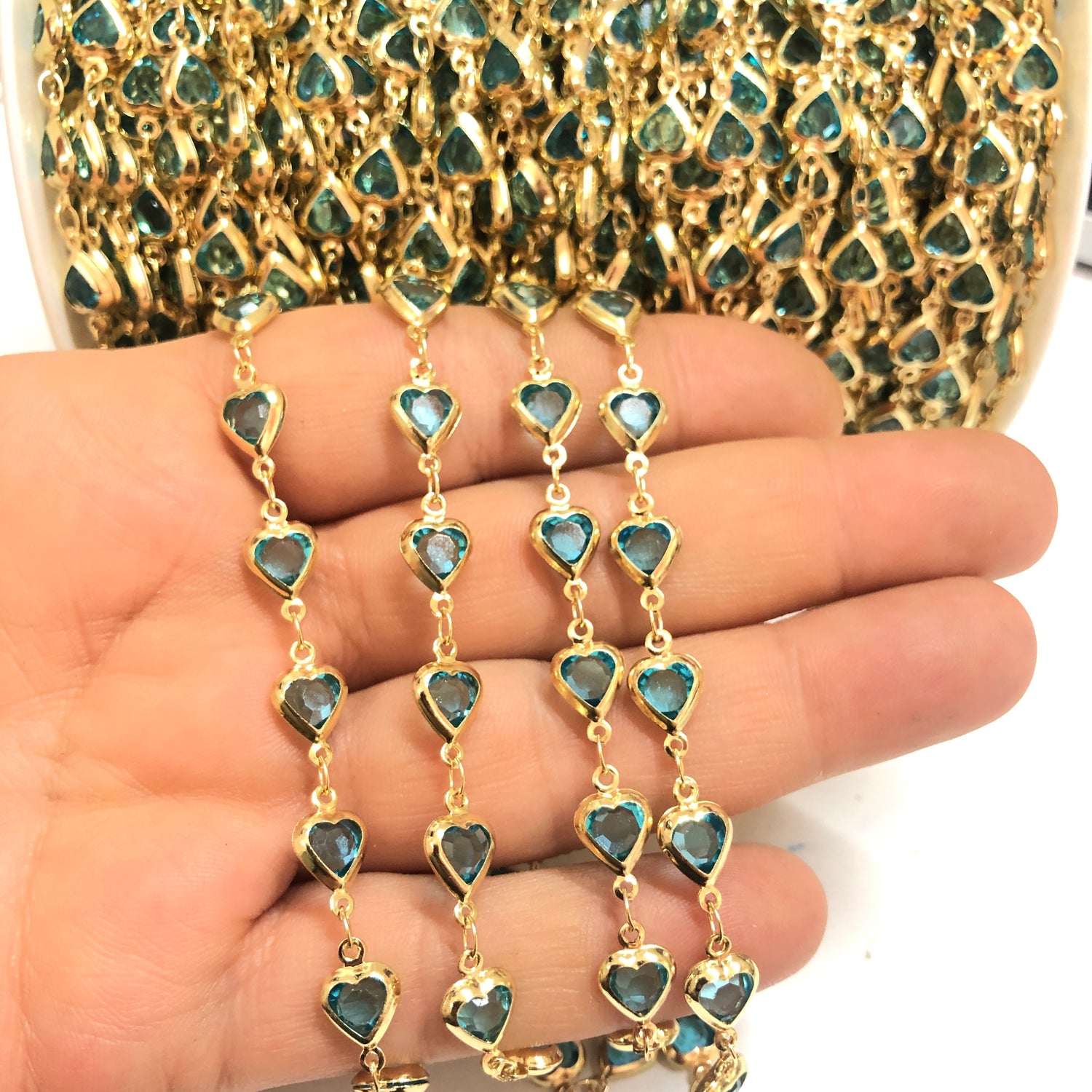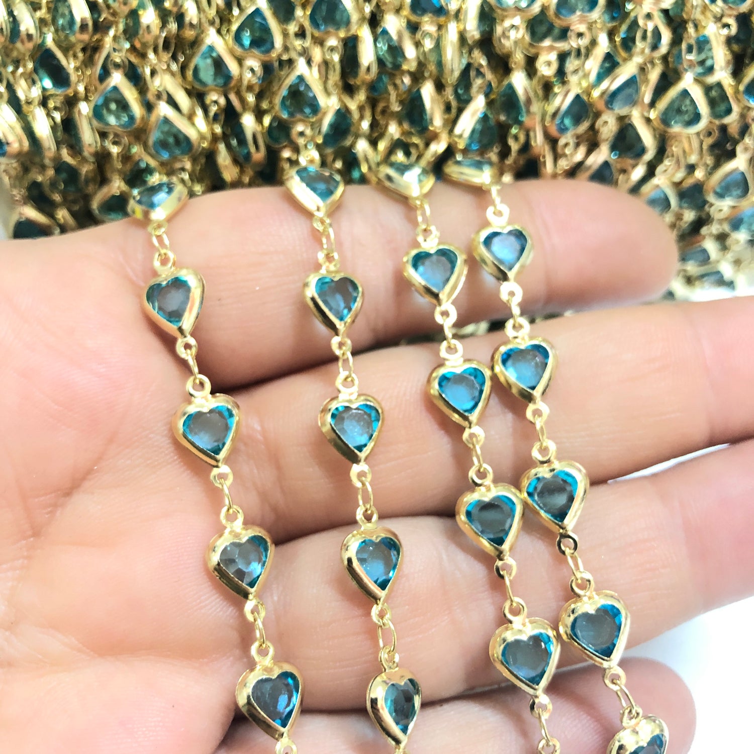 Altın Kaplama Kalp Taşlı Zincir Dik Delikli - Mavi