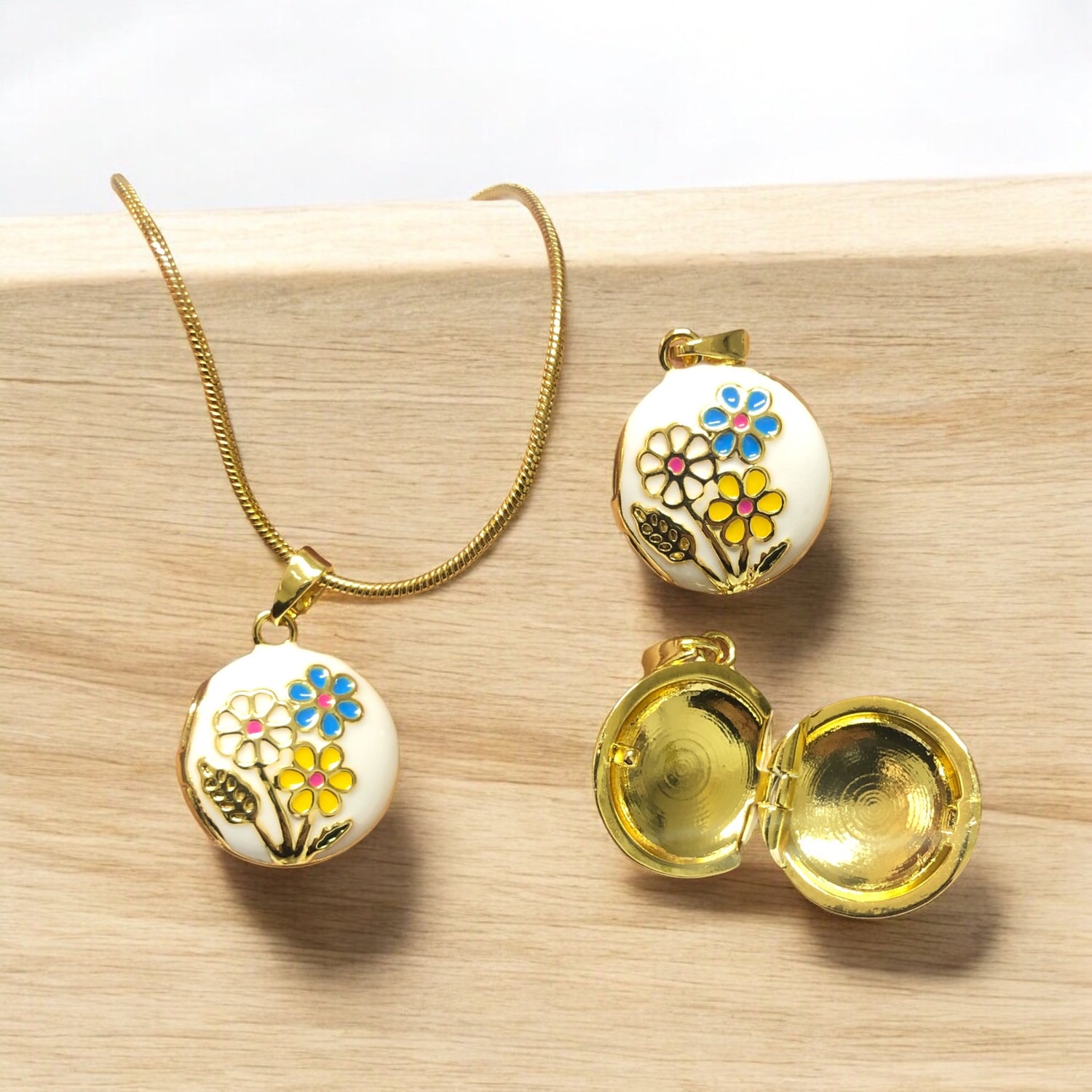 Altın Kaplama Mineli Açılabilir Kolye Ucu Yuvarlak -Beyaz Papatya